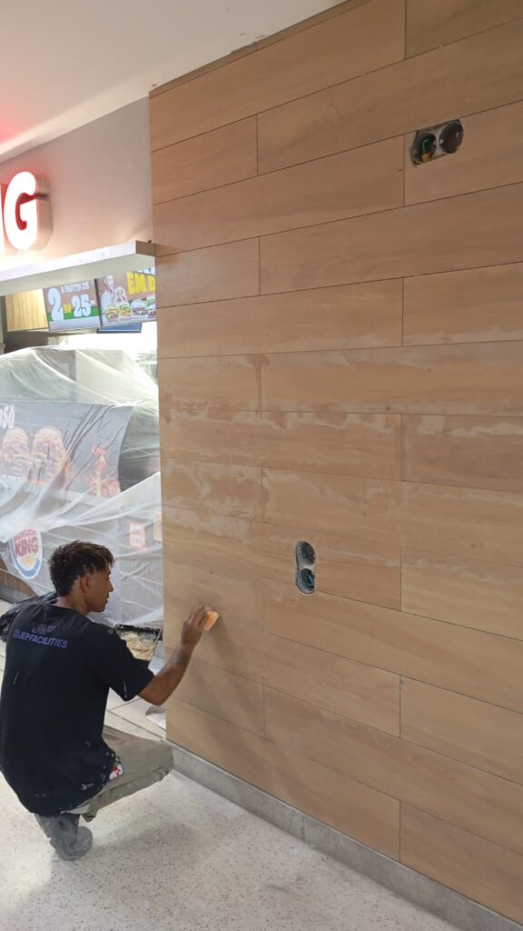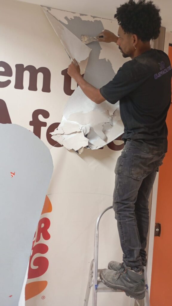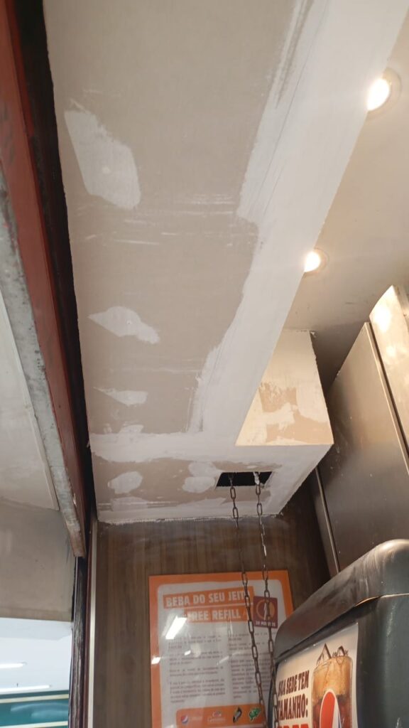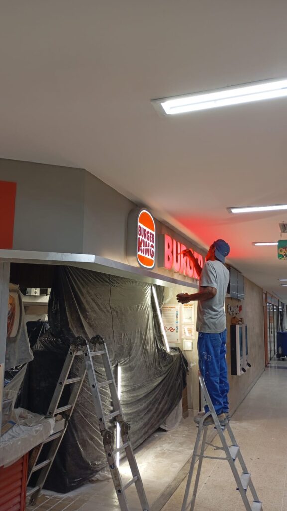 O escopo do projeto contemplou uma ampla gama de intervenções, incluindo pintura de paredes e tetos conforme o padrão visual do Burger King, recomposição e substituição de forros, tratamento e recuperação de pisos, além da instalação e substituição de cantoneiras em alumínio para proteção de quinas e reforço do acabamento.